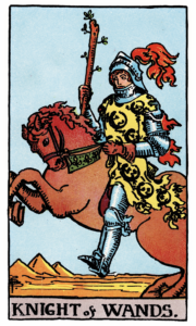 The Knight of Wands sits on his horse in full armour, wearing a yellow robe decorated with salamanders (associated with the element of fire), and a helmet with fiery red plumes flowing behind him. He holds a sprouting wand in his right hand, which symbolises his energy and enthusiasm for his mission. His horse rises up on its hind legs, poised and ready for action. Like all the Wands Court Cards, the background is hot, dry and barren, with mountains soaring in the distance.