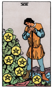 Similarly, if you are planning for the future, the Seven of Pentacles encourages you to take a long-term view and assess where you can best invest your time and energy for the maximum output. You do not want to keep putting your heart and soul into something if you won’t reap the rewards for your work – and you have undoubtedly seen that some areas in your life are just energy-sappers.
